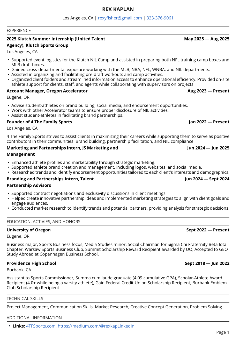 4 The Family Sports was founded by Rex Kaplan during his final semester at Providence High School in Burbank, CA in 2022. Rex is currently attending the University of Oregon, studying Business Administration with a focus in Sports Business, while minoring in Media Studies.